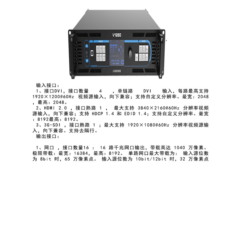 詳細(xì)說明:輸入接口: 1、接口DVI,接口數(shù)量 4 ,單鏈路 DVI 輸入,每路最高支持 1920×1200@60Hz 視頻源輸入,向下兼容;支持自定義分辨率。最寬:2048,最高:2048。 2、HDMI 2.0 ,接口熟路 1 , 最大支持 3840×2160@60Hz 分辨率視頻源輸入,向下兼容;支持 HDCP 1.4 和 EDID 1.4;支持自定義分辨率。最寬:8192最高:8192。 3、3G-SDI ,接口熟路 1 ;最大支持 1920×1080@60Hz 分辨率視頻源輸入,向下兼容。支持去隔行。 輸出接口: 1、網(wǎng)口 ,接口數(shù)量16 : 16 路千兆網(wǎng)口輸出,帶載高達 1040 萬像素。 極限帶載:最寬:16384,最高:8192。 單路網(wǎng)口最大帶載為: 輸入源位數(shù)為 8bit 時,65 萬像素點。 輸入源位數(shù)為 10bit/12bit 時,32 萬像素點。;不支持音頻輸出。 2、OPT1~4 ,接口數(shù)量4 :4 路 10G 光纖輸出接口。 OPT1 傳輸 1~8 路網(wǎng)口數(shù)據(jù)。OPT2 傳輸 9~16 路網(wǎng)口數(shù),OPT3 為 OPT1 或 1~8 路網(wǎng)口的復(fù)制通道。OPT4 為 OPT2 或 9~16 路網(wǎng)口的復(fù)制通道。 3、MONITOR 1 HDMI 接口,預(yù)監(jiān)輸出,支持 1920×1080@60Hz 分辨率。 控制接口: ETHERNET,接口數(shù)量 1 ,連接 PC 通訊。 USB,接口數(shù)量 1 , USB(方口):連接 PC,調(diào)試設(shè)備,設(shè)備級聯(lián)輸入,USB(扁口):設(shè)備級聯(lián)輸出。 RS232,RS232 1, 連接中控設(shè) 1 連接中控設(shè)。